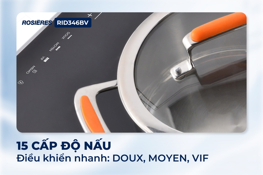 Rosières RID346BV sở hữu 15 cấp độ công suất, cho phép điều chỉnh nhiệt linh hoạt theo từng phương pháp chế biến, từ nấu chậm đến gia nhiệt nhanh ở nhiệt độ cao.