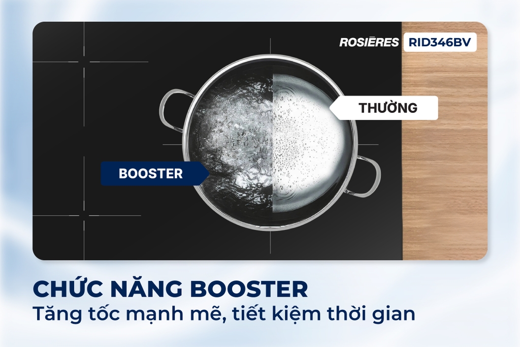 Bên cạnh đó, chức năng Booster tăng cường công suất tức thời giúp đun sôi nước hoặc làm nóng chảo chỉ trong thời gian ngắn, mang lại hiệu quả nấu nướng nhanh chóng và tối ưu cho nhịp sống hiện đại.