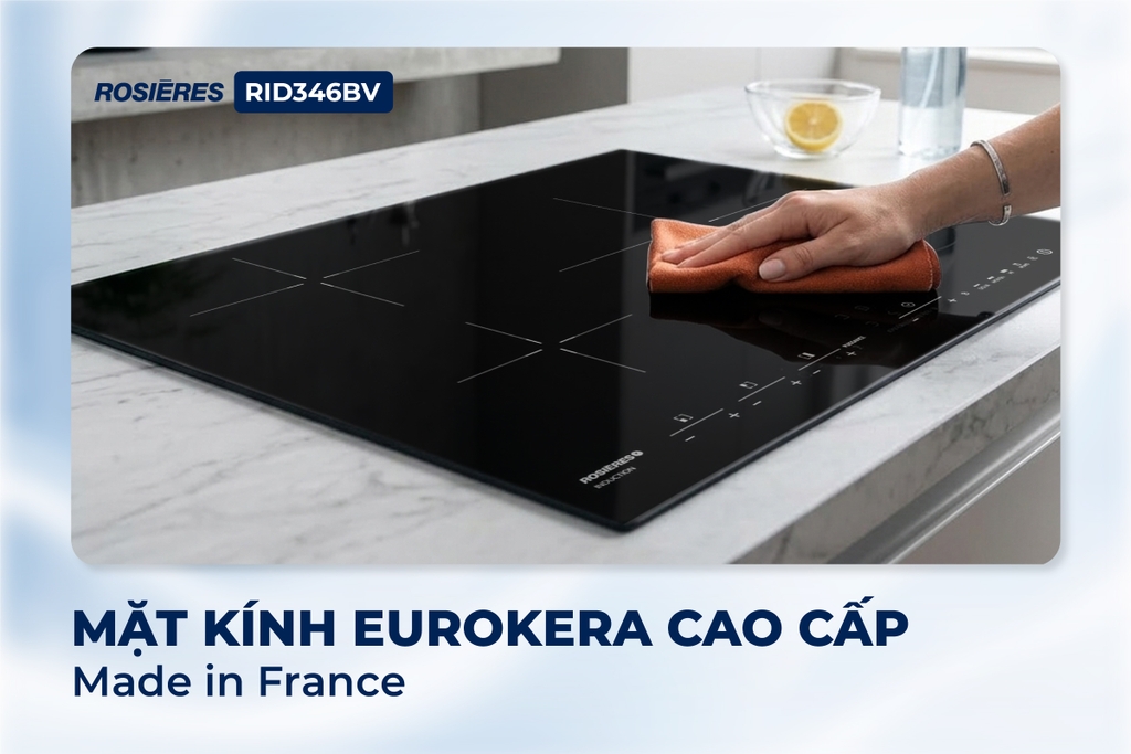 Rosières RID346BV sở hữu thiết kế tối giản thanh lịch, phong cách đặc trưng của các thiết bị nhà bếp Châu Âu. Mặt bếp sử dụng gốm kính EuroKera cao cấp sản xuất tại Pháp, nổi bật với khả năng chịu lực, chịu nhiệt và chống trầy xước tốt, giúp bếp luôn giữ được vẻ bền đẹp theo thời gian.