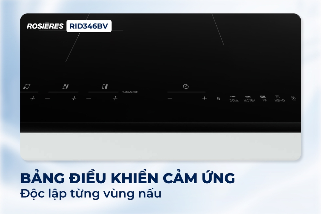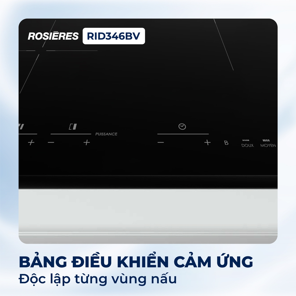 Rosières RID346BV được trang bị bảng điều khiển cảm ứng Touch Control hiện đại. Mỗi vùng nấu có hệ điều khiển độc lập, kết hợp cùng màn hình LED hiển thị rõ ràng, cho phép người dùng điều chỉnh công suất và nhiệt độ một cách chính xác theo từng món ăn.