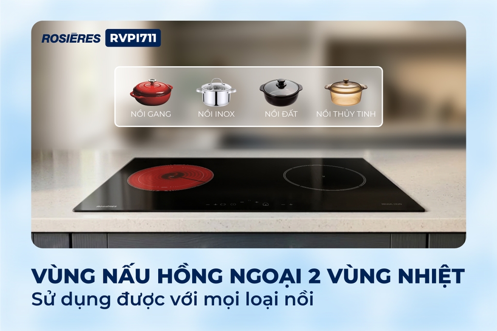 Một trong những bất tiện lớn nhất khi sử dụng bếp từ là phải thay mới toàn bộ nồi chảo. Với Rosières RVPI711, vấn đề này được loại bỏ hoàn toàn. Nhờ sự kết hợp giữa bếp từ và hồng ngoại, bạn có thể: