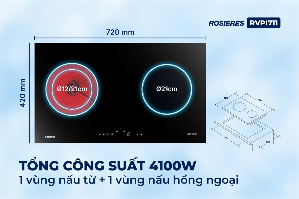 Với tổng công suất 4100W, bếp kết hợp Rosières RVPI711 cho phép chế biến đồng thời trên cả hai vùng nấu mà vẫn đảm bảo tốc độ gia nhiệt nhanh và hiệu suất vận hành ổn định. Đây là mức công suất lý tưởng cho căn bếp hiện đại, cân bằng giữa hiệu năng mạnh mẽ và khả năng tiết kiệm điện năng.