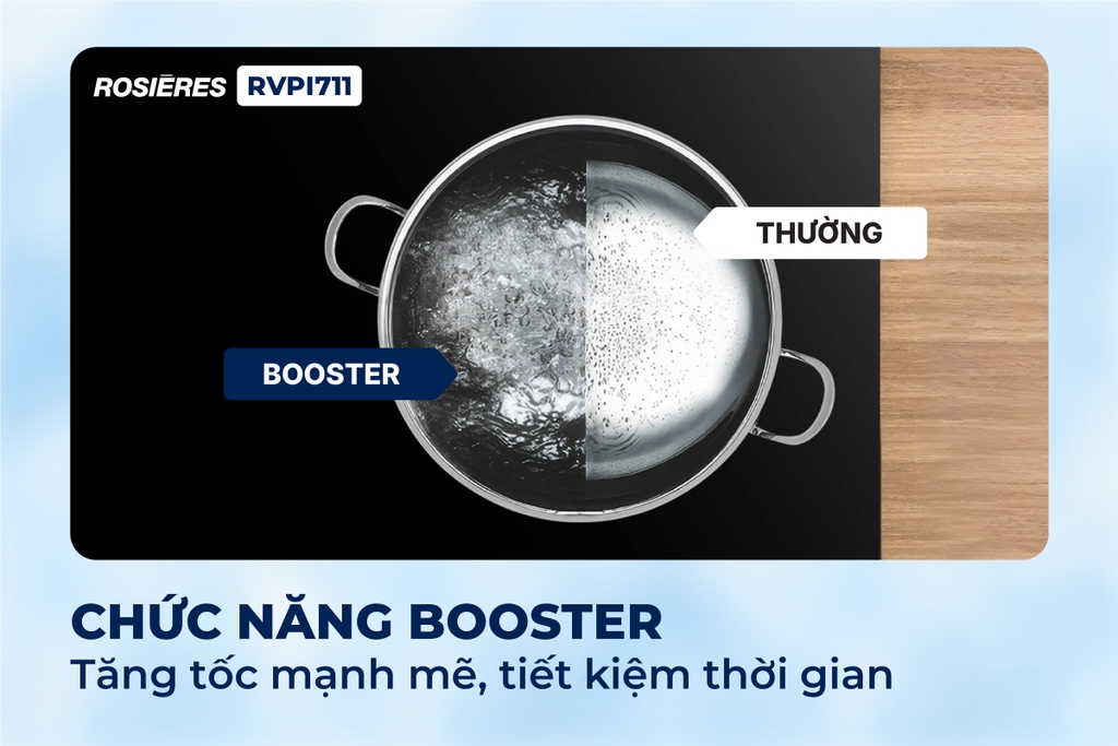 Vùng bếp từ được tích hợp chức năng Booster tăng cường công suất tức thời, giúp